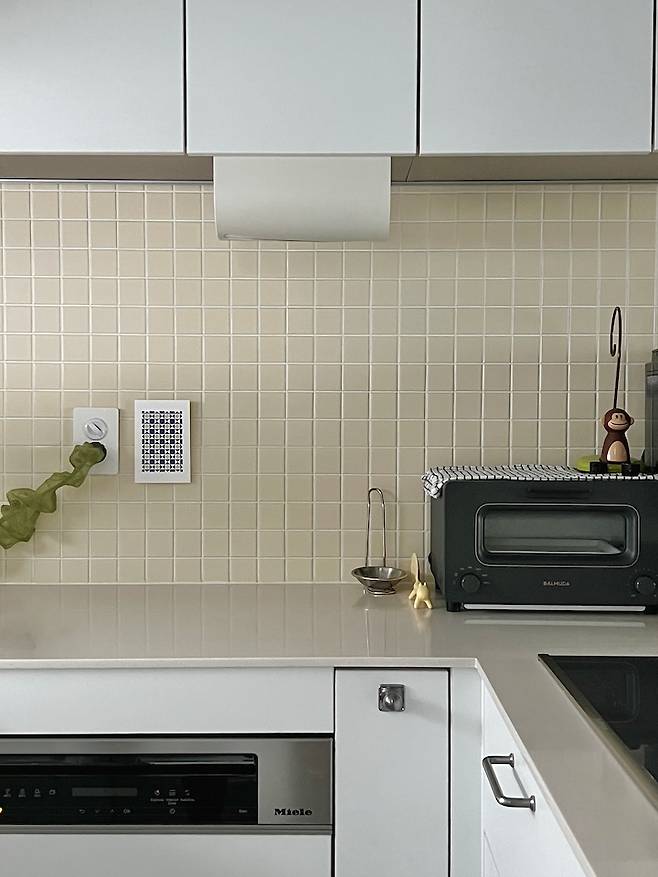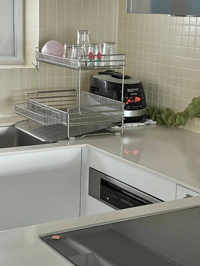 싱크볼과 식기세척기, 인덕션 싱크대의 3면을 모두 활용하면서도 제 역할을 잘 해주고 있는 공간이에요. 그리고 주방 콘센트가 벽면 중간에 있다 보니 회색의 가느다란 밥솥 전선이 항상 아쉬움이 있었어요. 매일 사용하는 밥솥이라 전선을 빼두는 일이 없다 보니 사부작사부작 코트 삭스를 만들어 전선을 가려 주었어요.