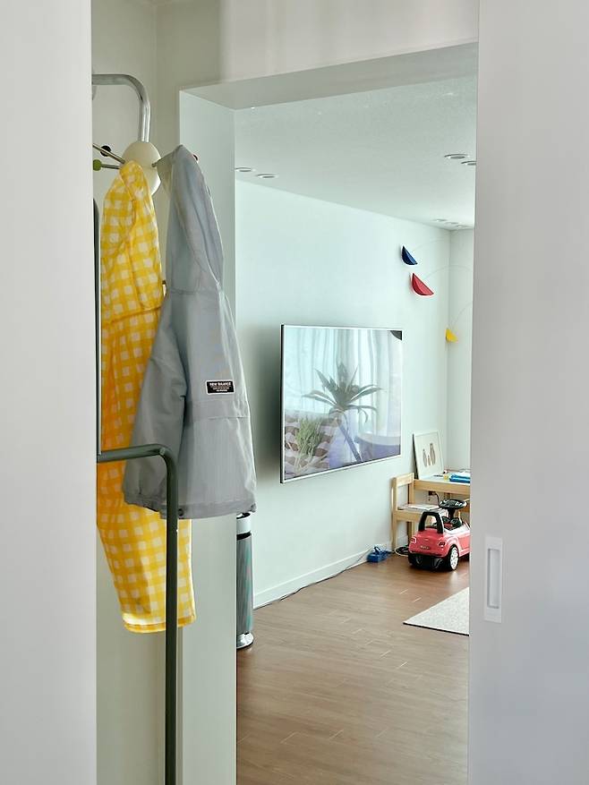 한샘장이 자리를 잡고 언니에게 집들이 선물로 받은 빈티지 행거도 걸어 주었어요. 여기엔 외출 전, 후에 챙겨 나갈 아이의 겉옷과 가방, 모자를 걸어두고 있답니다.