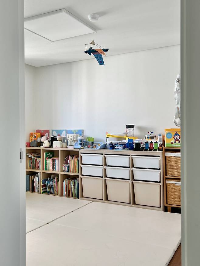 아이의 방은 커갈수록 사용하고 필요한 가구가 많이 바뀔 예정이라 최소한의 필요한 가구만 두었어요. 감성적인 아이 방을 원했지만 자동차 장난감을 자주 가지고 노는 만큼 활동 범위도 넓다 보니 놀기 편하게 정리해 주었어요.