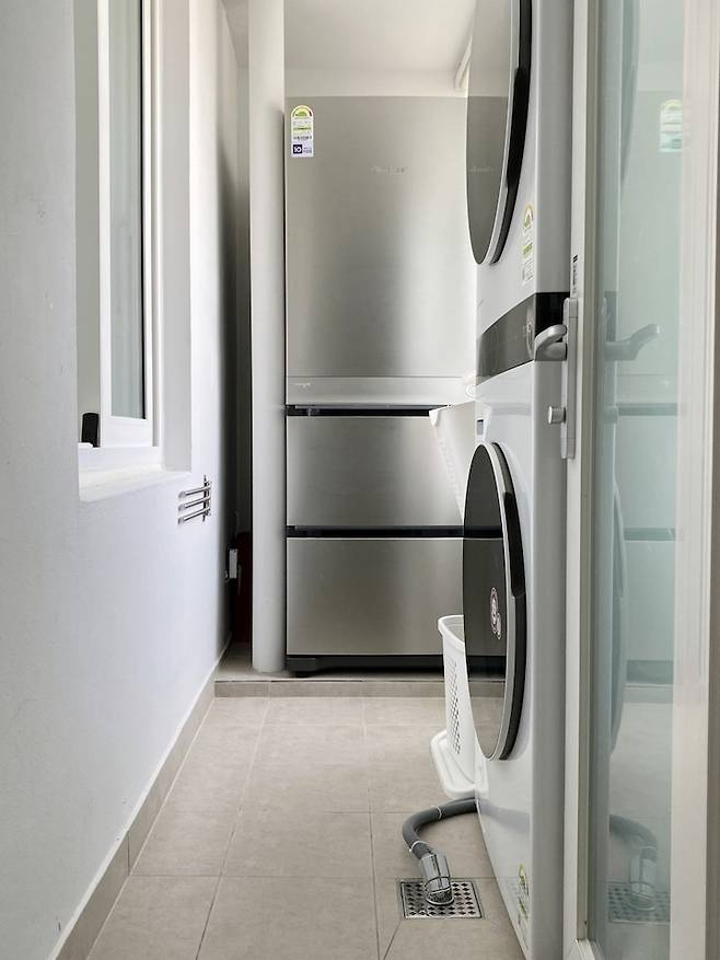 주방 베란다에는 김치냉장고와 세탁기가 있어요. 처음에는 정면에 팬트리를 만들고 싶었지만 김치냉장고는 포기할 수가 없었어요.