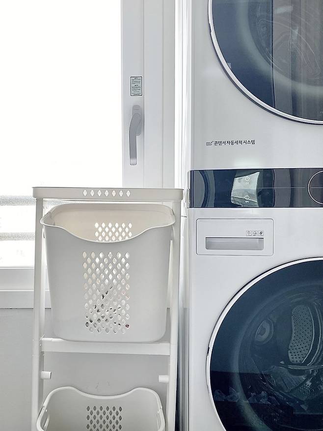 우리 집 빨래 바구니는 세로형의 사각형 상태라 세탁기 옆에 딱 붙여놓기 좋아요. 위로 빨래를 쌓아두면 흔들거림이 있어서 하단에 있던 바퀴를 빼고 사용하고 있어요.