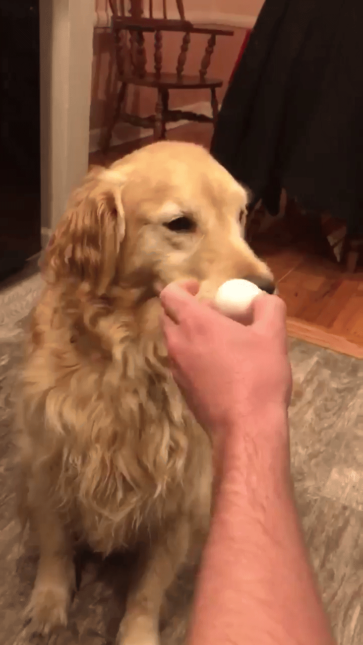 달걀을 물었다가 다시 그대로 뱉어내는 골든리트리버.