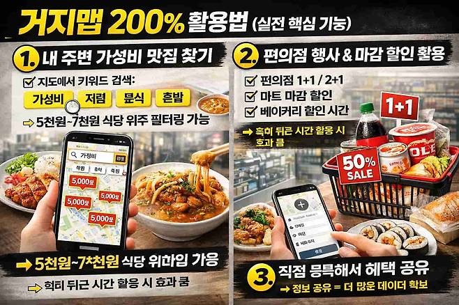 단순히 식당 정보에 그치지 않고 편의점의 '1+1', '2+1' 행사나 대형 마트의 마감 할인 정보까지 실시간으로 공유됩니다.