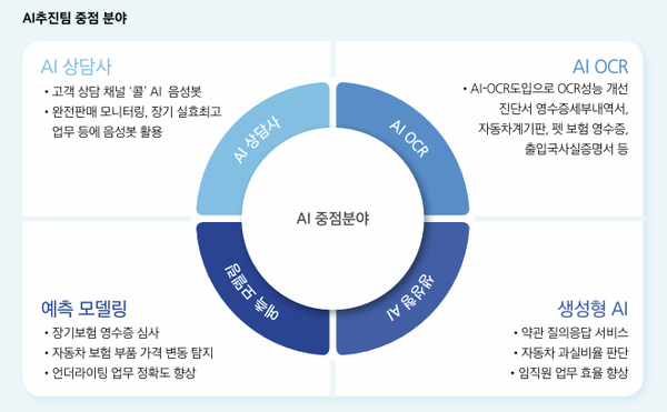 이 대표는 보험사기 예측 시스템, 보상 프로세스 자동화 등 현장 업무에도 AI 기술을 빠르게 접목시키것을 주문했다. 자동차보험에서는 과실 비율 자동 산정과 소송 지원에 AI를 활용 중이며 건강보험 보상 단계에서는 암 진단·수술 관련 기록을 AI로 분석해 정합성을 높였다. 일반보험 역시 청구와 심사를 자동화하는 시스템을 도입해 효율성을 끌어올리고 있다. 이는 비용 절감을 넘어 신속·정교한 서비스로 고객 만족도를 끌어올렸다.