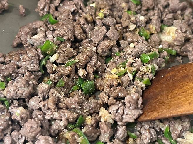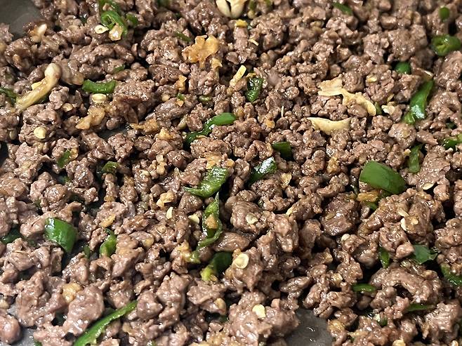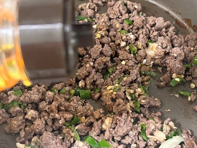 다진 소고기는 키친타월로 핏물을 최대한 제거한 뒤 팬에 약불로 볶으세요.