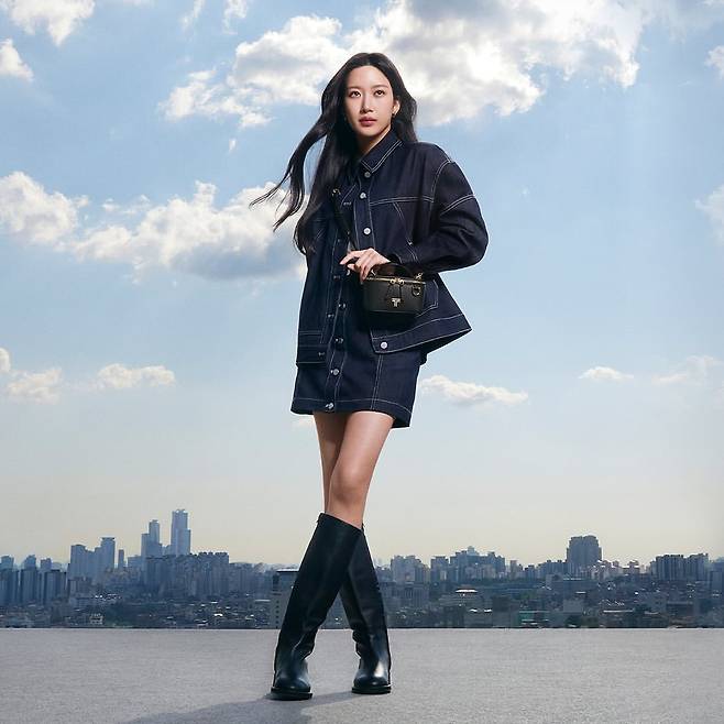 두 번째 사진에서 문가영은 데님 셋업 스타일을 연출하며 도시적인 분위기를 강조했다. 짙은 인디고 컬러의 데님 재킷과 스커트는 간결하면서도 세련된 매력을 보여준다. 여기에 블랙 롱부츠를 매치해 강렬한 존재감을 더했으며, 미니 크로스백으로 실용성과 스타일을 동시에 잡았다. 배경의 도시 풍경과 어우러져 모던한 감각이 돋보이는 룩이다.