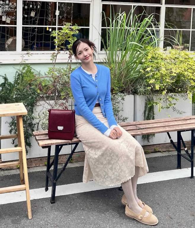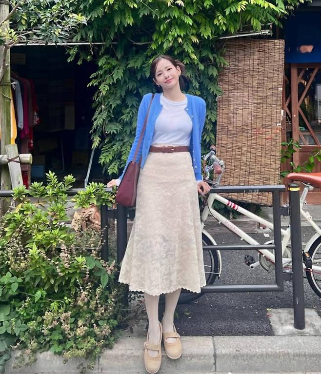 공개된 사진 속 하연수는 밝은 아이보리 레이스 스커트에 하늘빛 가디건을 매치했는데요.