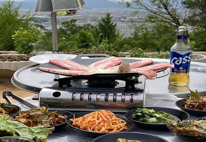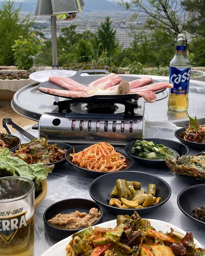 한적한 산속에서 즐기는 찐 레트로 감성 김해 '옥돌쉼터'. 넓은 야외에서 산을 바라보며 몸보신 음식을 즐길 수 있는 힐링 가득한 공간이다. 메뉴는 삼겹살과 백숙, 오리고기까지 다양한 메뉴가 준비되어 있어 취향에 맞게 골라 먹을 수 있다. 인기 메뉴는 푸른 산을 바라보며 구워 먹는 삼겹살. 푸짐한 밑반찬과 구워 먹기 좋은 김치, 마무리로 볶음밥까지 먹으면 낭만 가득한 힐링공간에서의 완벽한 한 끼 식사로 손색이 없다.