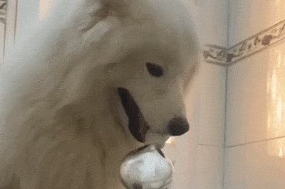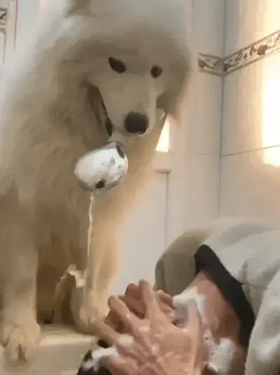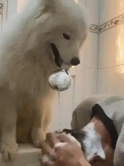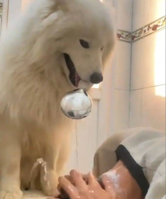 네티즌은 놀랍게도 그 물이 따뜻하다는 것을 깨달았죠. 알고 보니 사모예드는 주인에게 특별한 '샤워 서비스'를 제공하고 있었던 겁니다.