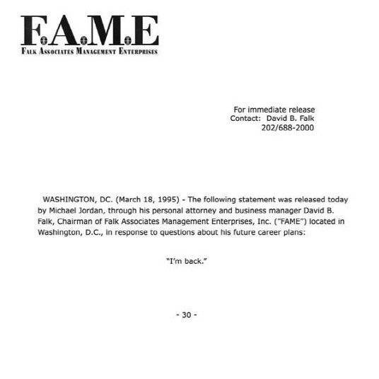 그리고 1995년 3월 미국의 언론사들은 “I‘m back(내가 돌아왔다)”이라고 짧게 쓰인 한 통의 팩스를 받는다. 18개월의 공백이 무색하게 조던은 다시 팀의 3연패를 이뤄냈고 2000년 두 번째 은퇴를 한 뒤 워싱턴 주주 겸 사장으로 취임한다. 그리고 2년 뒤 NBA의 인기를 회복시키고자 다시 복귀한다. 그는 40세가 된 2003년 시즌까지 평균 20득점 5리바운드 5어시스트의 성적을 남겼다.