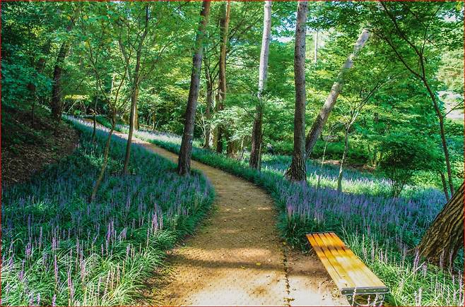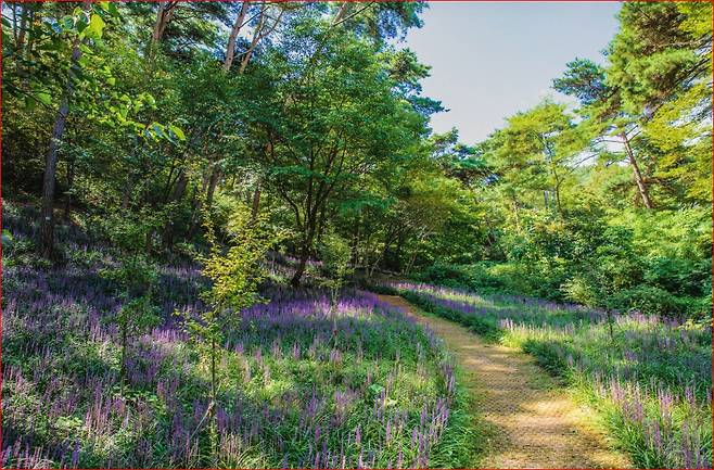 보랏빛 맥문동 군락지와 소나무 숲길을 따라 여유롭게 걷고 싶은 여행자