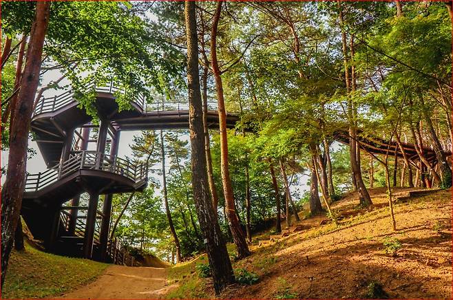 맥문동 군락지를 지나면 만나게 되는 곳이 바로 백화산 트리워크입니다. 총연장 248m의 데크길이지만, 빽빽한 소나무 숲 사이를 공중에서 걷는 듯한 특별한 경험을 제공합니다.