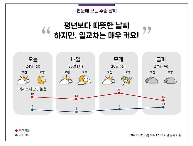 한낮 기온이 11℃ ~ 24℃를 보이며
