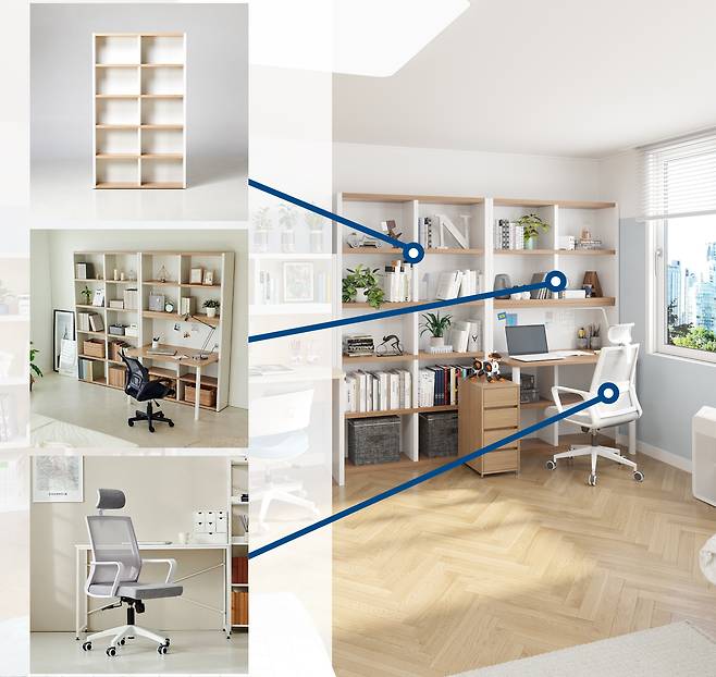 에반스베러의 책장과 책상 같은 경우 니노보다는 더 높고 많은 수납을 할 수 있는데요. 여기에 추가로 4단 다용도 서랍장을 배치하여 수납을 더 늘려줬어요. 의자는 깔끔한 그레이로 휴고 오피스 체어로 배치했답니다. 목과 허리를 잡아주고 통기성이 뛰어나, 오래 앉아있어도 편안한 것이 장점!