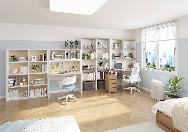 고학년 자녀를 위한 에반스베러의 책장+책상 의자로 구성된 공부방입니다. 책장을 두 형제에게 같은 방향으로 배치해 공간을 만들어 붙어있지 않도록 해줬어요. 에반스베러도 모던하우스의 상품으로 견고하고 오염에 강하며 깔끔하고 안전한 라운딩 모서리 등의 마무리를 마감했어요.