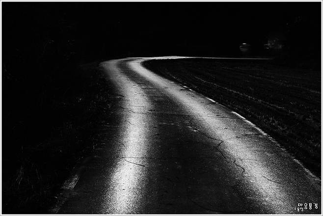 「 1차선 아스팔트 시골길, 늦은 오후 빛을 받은 바퀴 흔적에 노출을 맞춰 어둡게 촬영했다. 렌즈 24~70mm, iso 100, f13, 1/125초,-2ev.