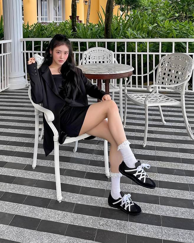 블랙 미니 원피스에 오버사이즈 재킷을 매치한 시크한 스타일링을 보여주고 있다. 프릴 양말과 블랙 앤 화이트 스니커즈로 귀여운 요소를 가미했으며, 화이트 테이블과 의자가 있는 리조트 분위기와 완벽한 조화를 이루고 있다.
