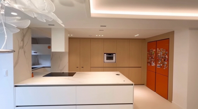 이탈리아에서 수입한 자재와 아트월, LED 조명 수납장 등으로 완성된 주방은 실용성과 감성을 동시에 잡았다는 평을 받고 있다.