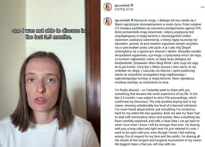 하지만 이제는 모든 것이 면밀하게 해명되어 아무런 의심 없이 다시 제가 가장 사랑하는 테니스를 칠 수 있게 되었다. 저는 그 어느 때보다 강해질 수 있다고 믿는다. 지금은 이 시련이 끝났다는 것에 그저 안심하고 있다. 저는 아무것도 잘못한 것이 없다는 것을 알면서도 여러분에게 정직하고 싶습니다. 팬 여러분과 사람들에 대한 경의를 담아 인생에서 가장 오래, 그리고 어려운 투쟁에 대한 자세한 내용을 모두 전해드리도록 하겠다. 저의 가장 큰 소원은 여러분이 앞으로도 제 곁에 있어 주는 것이다."