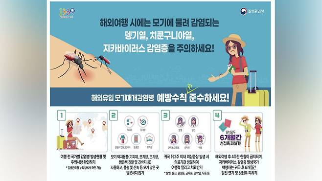 질병청은 해외여행을 떠날 때 해당 국가의 감염병 발생 현황과 주의 사항을 확인하고 모기 기피제, 모기장 등을 준비해야 한다고 당부했습니다.