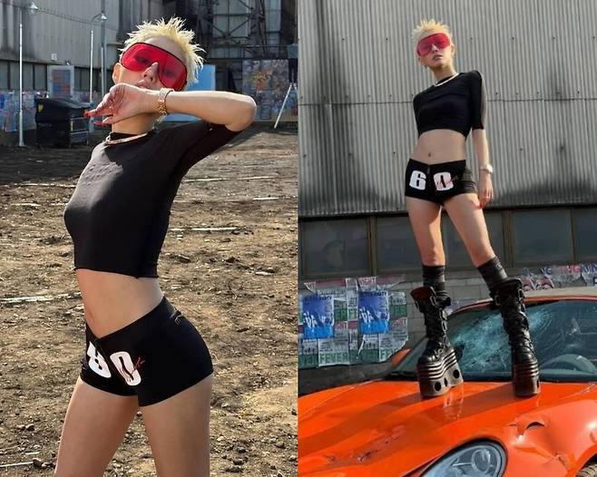 아이돌 전소연이 크롭탑과 초미니 핫쇼츠로 하이퍼 펑크 감성의 스트리트룩을 완성했습니다.