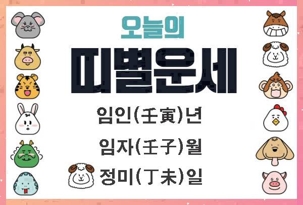 2022년(단기 4355년) 12월 20일 화요일(음력 11월 27일) "더사주" 띠별 운세오늘은 임인(壬寅)년, 임자(壬子)월이고, 일진(日辰)은 정미(丁未)입니다.