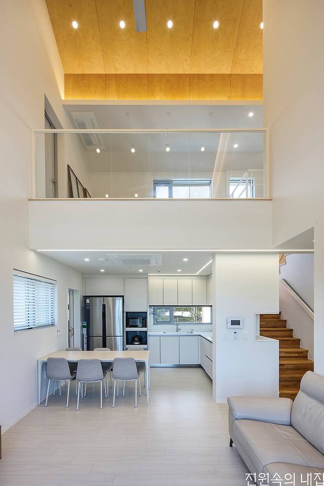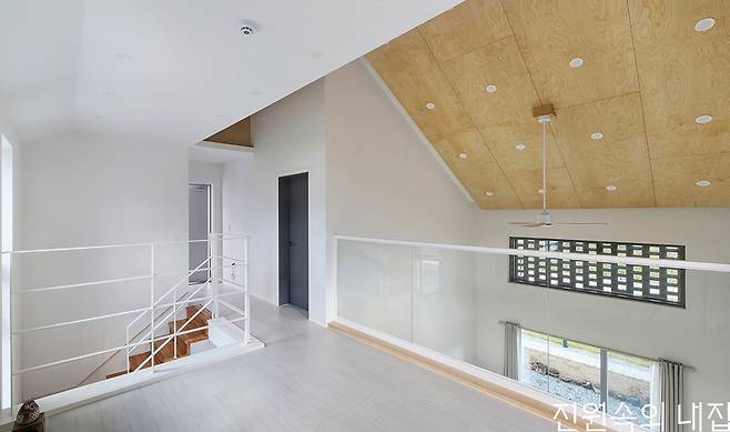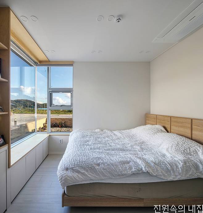 건축주가 생활하는 집은 필요한 공간만 모아 단순하지만 알찬 구성을 보여준다. 1층의 거실 공간은 2층의 높은 층고까지 시원하게 열려 있는 구조로, 이는 건축주의 요청 사항 중 하나였다. 또 한 가지 로망은 윈도우 시트. 안방의 큼지막한 코너창 앞으로 윈도우 시트가 있어 남쪽의 뷰와 나머지 안쪽 땅들을 내다볼 수 있다. 2층에는 중정 가벽 위의 공간을 널찍한 야외 휴게 공간으로 활용했다.