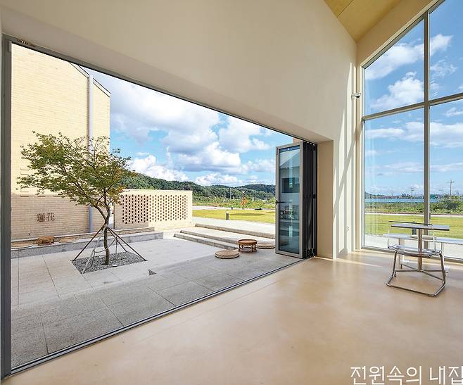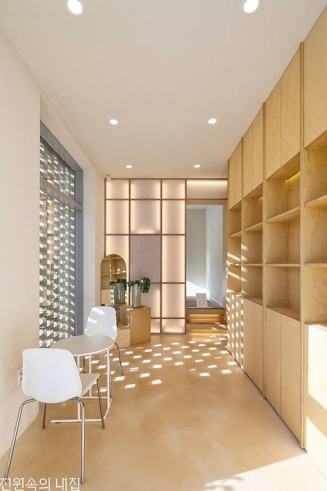 최유정 소장은 카페와 주택을 별동으로 지어 프라이버시를 최대한 확보할 수 있도록 구성했다. 그리고 두 건물 가운데에 가벽을 설치해 중정 공간을 만들어냈다. 중정은 대지 레벨보다 낮게 형성돼 한층 아늑하고 편안한 분위기가 느껴진다. 하지만 중정 자리에는 강제 배수 시스템이 없는 상황이었기 때문에 물이 고이거나 곰팡이가 생기지 않도록 배수로를 2개소로 분리하여 설치하고, 별도의 집수정을 설치하는 등 난도가 높은 시공이 따라와야 했다. 까다로운 시공 과정을 거쳐 탄생한 중정은 카페와 주택의 연결고리이자 손님들이 공간을 더욱 풍성하게 즐길 수 있도록 도와주는 카페의 아이덴티티가 되었다.