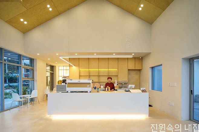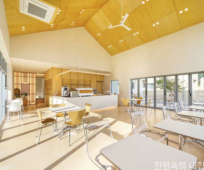 두 건물은 별동으로 지어졌지만 박공 지붕으로 높은 층고를 구성하고, 같은 벽돌 외장재를 쓰는 등 하나의 콘셉트를 공유하고 있다. 특히 벽돌의 색상을 고르는 것에 심혈을 기울였는데, 줄눈과 창호의 색깔 등도 이에 맞게 함께 고려해 완성도를 높였다. 내부는 전체적으로 화이트 컬러와 원목 재질로 마감해 세련되고 따뜻한 이미지를 형성한다. 카페는 실제로는 약 38평으로 넓지 않은 면적이지만 앞마당을 향해 시원하게 열려 있는 전면 창과 중정 쪽 폴딩도어를 통해 공간이 실외로 확장된 느낌을 준다. 카페 안쪽에는 건축주의 요청으로 프라이빗한 좌식 공간 또한 마련되어 있다. 카운터 뒤쪽에는 넓은 작업실이 있는데, 건축주는 가벽 뒤 복도로 연결된 옆문을 통해 집과 작업실을 편리하게 드나든다.