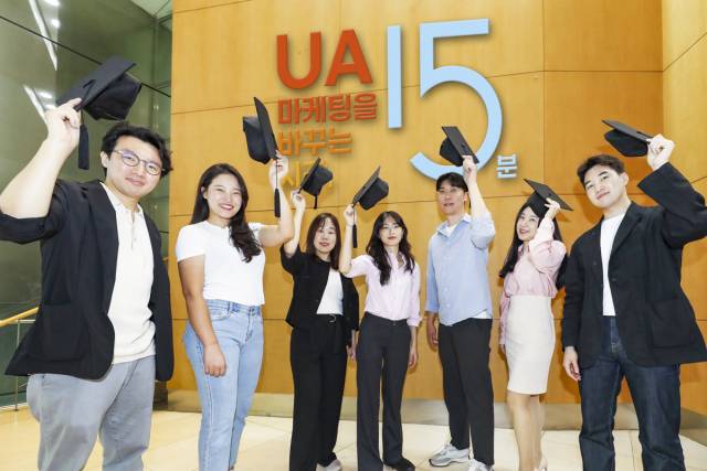 지난 15일 서울 강남구 포스코타워 역삼에서 열린 실무 UA 마케터를 위한 인사이트 세미나에서 참석자들이 교육 이수를 기념하며 학사모와 함께 포즈를 취하고 있다.