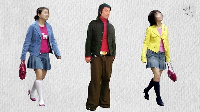 이 사진들을 보라. 2000년대 초반 서울의 길거리 패션이다. 오색찬란한 색감의 티셔츠들과, 화려한 패턴, 의도를 알 수 없는 새로운 시도가 넘쳐나던 시기였다.