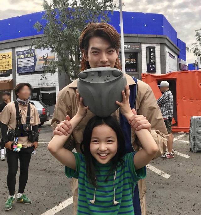 공개된 사진 속 김우빈은 SF 판타지 액션 영화 '외계+인'(최동훈 감독, 케이퍼필름 제작) 1부에서 호흡을 맞춘 이안(김태리)의 아역 최유리와 함께한 모습을 담았다.