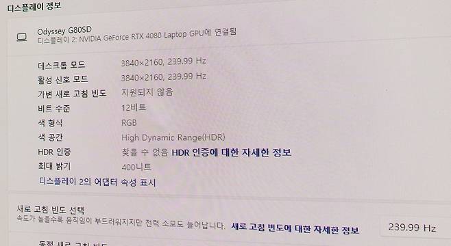 삼성전자 오디세이 G80SD OLED 모니터와 연결할 시에 최대 색상 심도 12비트 / 주사율 240hz 까지 연결이 됩니다.