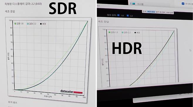 대신 감마값 측정은 제대로 확인을 했습니다. SDR 기준 감마 2.2를 완벽하게 보여주고 HDR 기준 감마 1.8 곡선그래프를 거의 비슷하게 따라간것을 보면은 색정확도 또한 완벽하다고 할 수 준입니다.