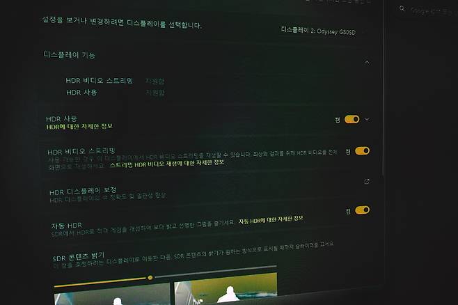 명암비가 따라가지 못해서 일반적인 모니터가 HDR 사용시 SDR 모드라고 하더라도 하얗게 떠버리는현상이 발생하거나 하는데 명암비 자체가 높고 대비가 확실해서 SDR 콘텐츠 밝기를 중간값에 높고 사용해도 전혀 문제가 없었습니다.