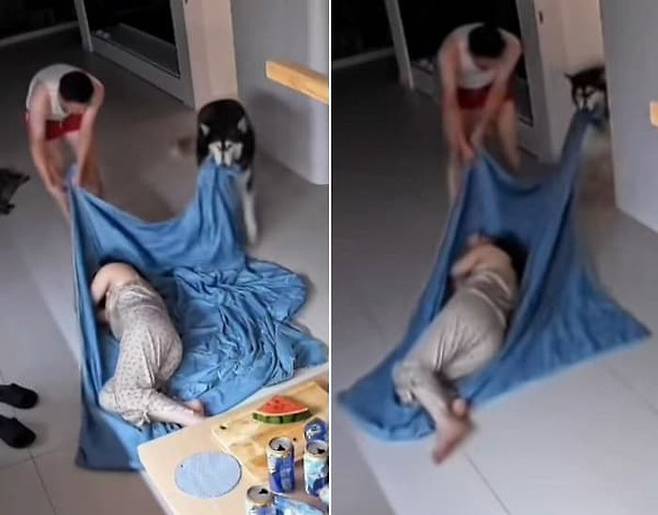 아빠 옆에서 모든 상황을 지켜보고 있던 시베리안 허스키 강아지에게 도움을 청합니다. 아빠는 녀석에게 이불 한쪽 끝을 물라고 시킨 것.