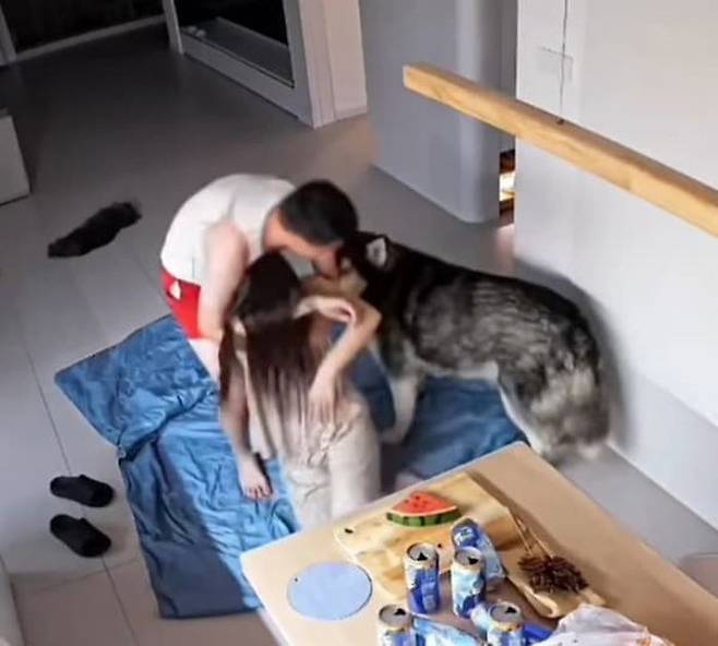 잠시후 시베리안 허스키 강아지는 아주 똑똑하게 아빠를 도와줬다고 하는데요. 술에 취한 엄마를 아빠랑 같이 침대로 옮긴 것.