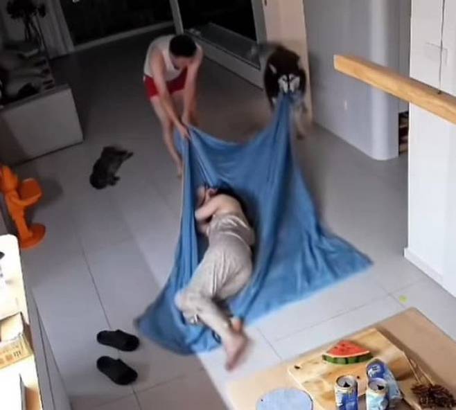 아빠와 시베리안 허스키 강아지는 힘을 합쳐 엄마를 태운 이불을 침실까지 무사히 옮기는데 성공합니다.