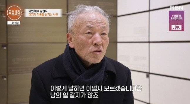 19일 방송된 MBN ‘특종세상’에는 배우 임현식이 출연해 근황을 공개했다. 임현식은 “독거 생활을 오래했다. 그렇게 지내다 보니 생활이 규칙적이지 못했다”며 “혈관계에서 치료하자고 해서 스텐트 시술을 해야 한다더라. 그러니 피 돌림이 좋아졌다”고 밝혔다.