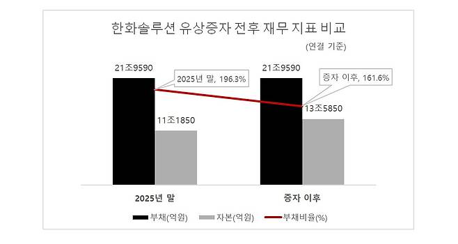 증자를 단행할 경우 부채비율은 2년 전 수준으로 낮아질 전망이다. 한화솔루션의 지난해 말 기준 자본은 11조1850억원으로 유증 자금을 단순 더하면 13조5850억원이다. 이에 따른 부채비율은 161.6%로, 이전 대비 34.7%p 낮아진다는 계산이다.