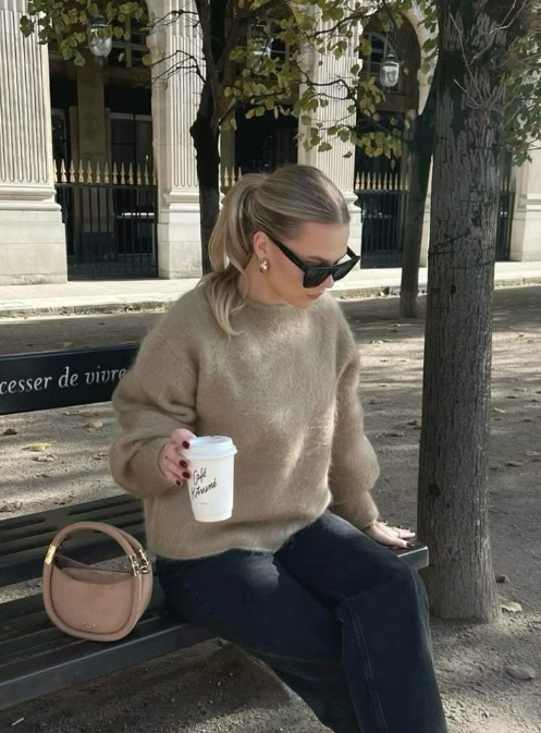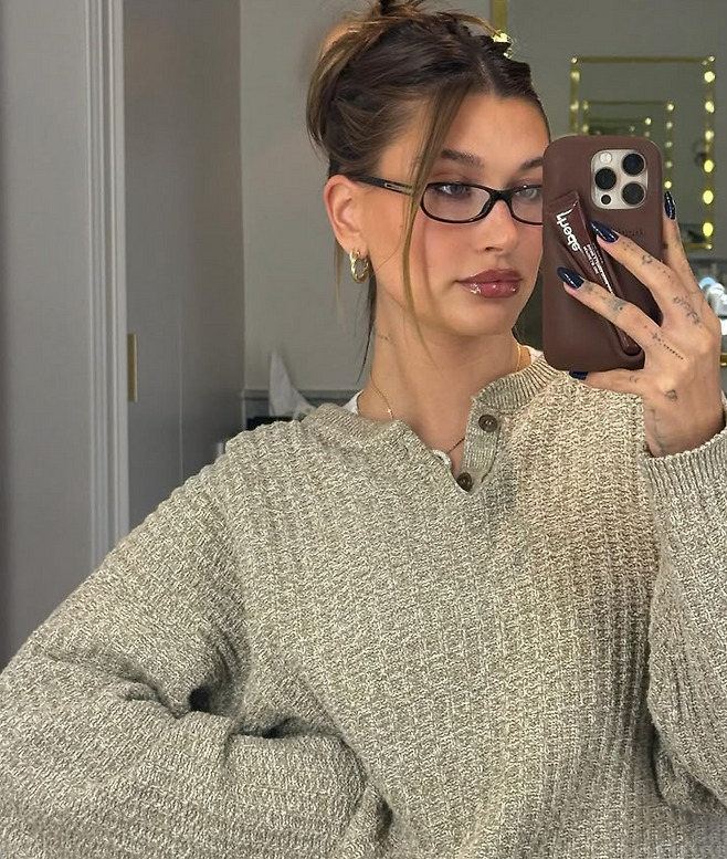 거울 앞에서 자연스럽게 셀카를 찍는 그녀, 무심한 듯 묶어 올린 헤어스타일과 빈티지한 안경, 편안한 니트까지 모든 것이 꾸안꾸의 정석이야. 그런데 여기서 가장 눈길을 사로잡는 건?
