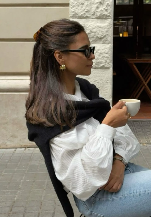 바로 귓가에 살짝 반짝이는 14K 골드 귀걸이. 심플하지만 확실한 존재감을 발산하며 룩 전체에 고급스러운 분위기를 더해주고 있어. 한편, 파리의 거리에서 클래식한 화이트 셔츠에 스카프를 두른