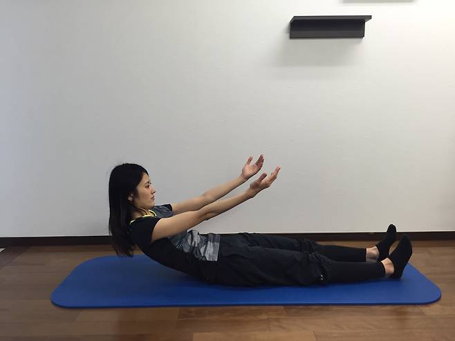 복부의 힘으로 천천히 상체를 들어 올리며 롤업한다.
