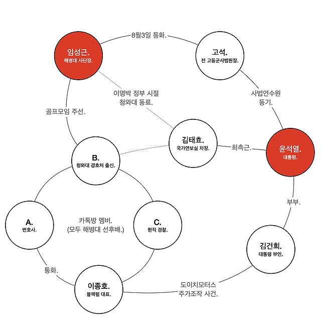 - 임성근과 이종호(블랙펄인베스트먼트 대표)가 골프 모임 약속을 잡던 사이라는 사실이 알려진 바 있다. 이종호는 도이치모터스 주가 조작 사건 때 김건희의 주식 계좌를 관리했다는 의혹을 받는 사람이다. 이종호가 다른 해병대 후배에게 이런 말을 한 녹취록이 남아있다.