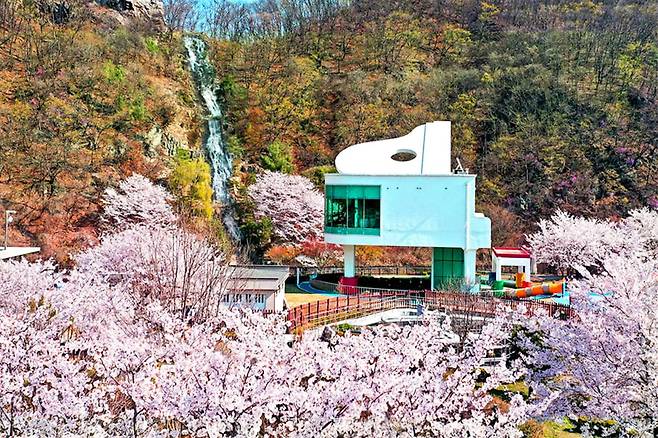 피아노폭포의 추천 포인트는 피아노 모양 폭포와 벚꽃이 조화를 이루는 이색적인 풍경입니다.