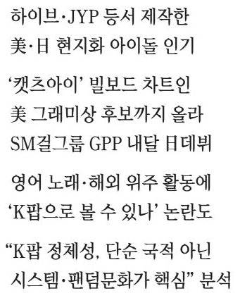 걸그룹 '캣츠아이'가 대표적인 사례다. 캣츠아이는 지난 6월 말 발표한 '가브리엘라'가 이달 22일자 빌보드 핫100 차트에서 31위에 오르며 최고 성적을 기록했다. 데뷔 이후 첫 30위권 진입이다. 캣츠아이는 미국 대중음악계 최고 권위인 그래미 어워드에서 '올해의 신인상'과 '베스트 팝 듀오·그룹 퍼포먼스상' 두 부문 후보에 이름을 올리기도 했다.