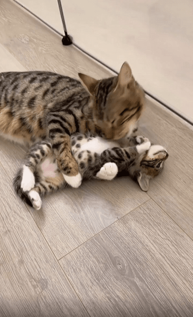 어미 고양이는 새끼 고양이의 배 쪽을 조심스럽게 핥고 있습니다. 부드러운 혀가 느릿느릿 오가며, 털을 정리해주는 동시에 따뜻한 체온을 전달합니다. 새끼는 그 품 안에서 고요히 눈을 감고, 작은 앞발은 몸 쪽으로 모은 채 꿈틀거리기도 하지만 도망치려 하지 않습니다. 그건 어쩌면, 이 순간이 가장 안전하고 포근하다는 걸 이미 아는 몸의 반응일지도 모르죠.