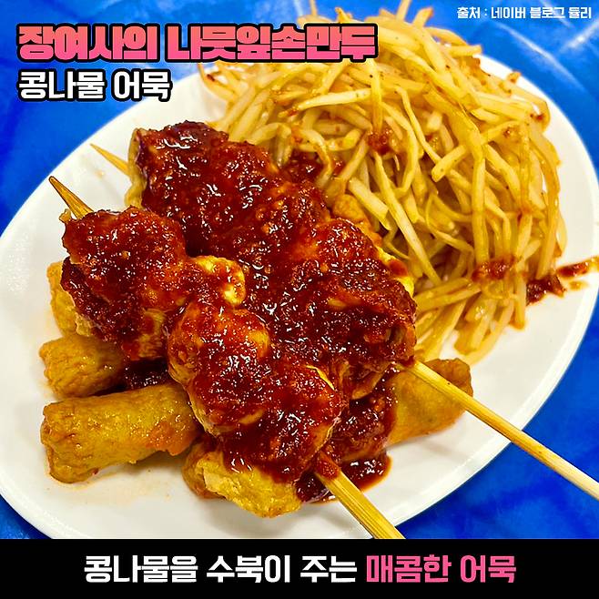어묵 맞는데 그냥 어묵이 아니라 콩나물이 산처럼 수북이 올라가있는 어묵이에요. 포장마차에서 어묵을 먹을 땐 간장을 찍어 먹는데 콩나물 어묵엔 빨간 양념이 되어있어서 따로 간장 찍어 먹을 필요가 없습니다.