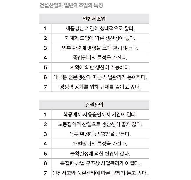 그렇다면 왜 설계변경으로 인하여 발주자와 시공자 간에 불편한 일들이 심심치 않게 발생하게 되는지 여기서 잠깐 건설산업과 일반제조업 간의 차이점이 존재한다는 것을 이해하고 넘어가 봅시다.