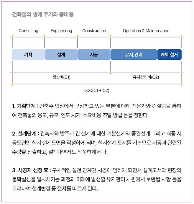 앞의 표에서 사용된 LCC라고 하는 ‘Life Cycle Cost’는 말 그대로 건축물의 생애 주기에 소요되는 총비용과 기능적 측면에서 최상의 방법을 찾고자 할 때 나타내는 한 축입니다. 기획부터 유지, 관리 등 모든 단계에서 많은 선택과 번복을 통하여 최상의 방법을 찾아가는 과정에서 상대자가 있을 경우, 양해를 구해야 하고 그에 따른 대가가 필요할 것입니다.